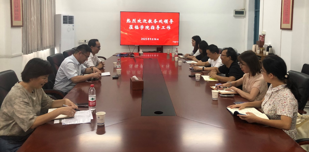 本网讯(文/图 郑丽)9月16日下午,学校教务处副处长周明智带领相关科室负责人一行莅临外语外贸学院开展教学工作专项调研指导。外语外贸学院领导班子成员、专业负责人参加调研座谈会。会议由副院长王辰晖主持。
