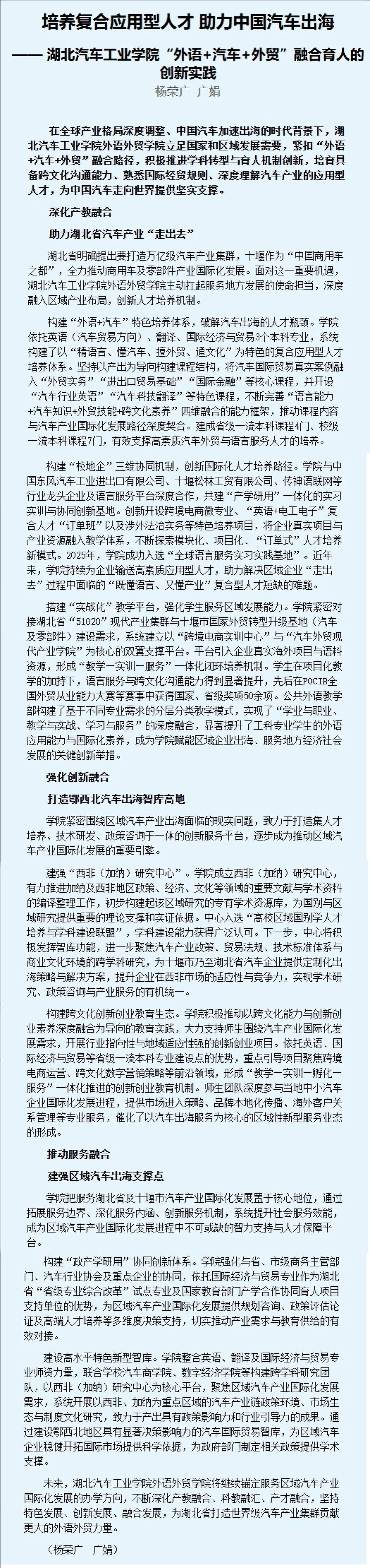 最近,《中国教育报》聚焦学院“外语+汽车+外贸”融合育人实践经验